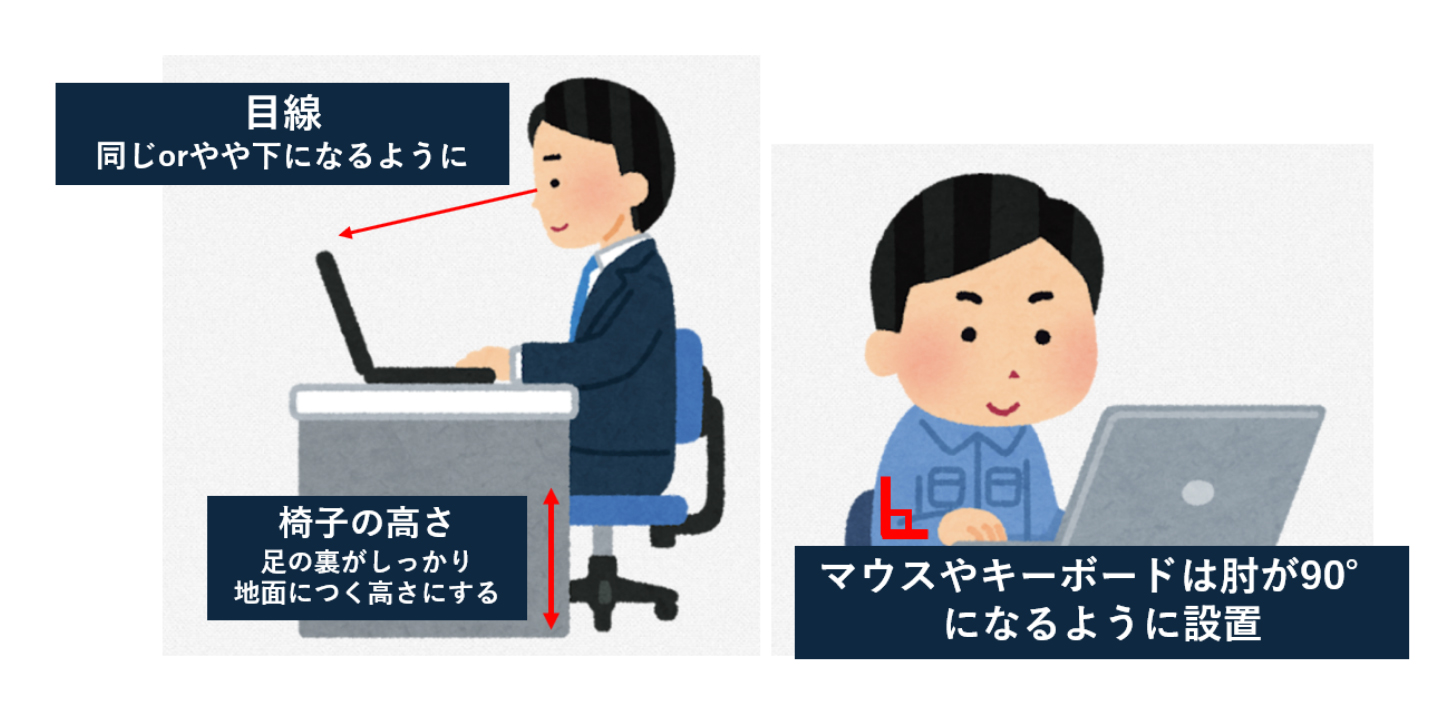 デスクワークは一見身体的負担が少ないように思われがちですが、実際にはパソコン作業中の不適切な姿勢によって、肩こりや腰痛などの身体的な不調を引き起こすリスクがあります。以下に、デスクワークのポイントについてお伝えします。